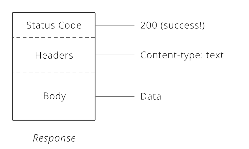 - Response — consists of a status code (200, 404…), a list of headers, and a body.