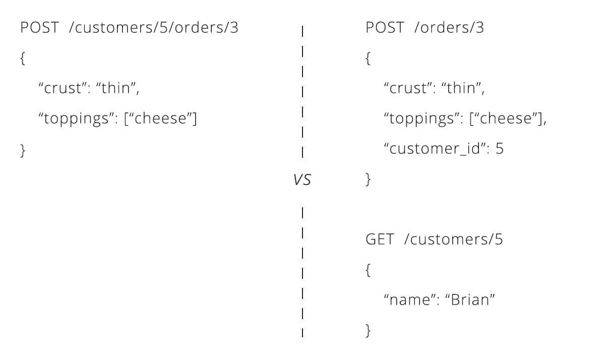 REST practitioners are split on how to solve the problem of associating resources. Some say that the hierarchy should continue to grow, giving endpoints like /customers/5/orders for all of customer #5’s orders and/customers/5/orders/3 for customer #5’s third order. Others argue to keep things flat by including associated details in the data for a resource. Under this paradigm, creating an order requires a customer_id field to be sent with the order details. Both solutions are used by REST APIs in the wild, so it is worth knowing about each.