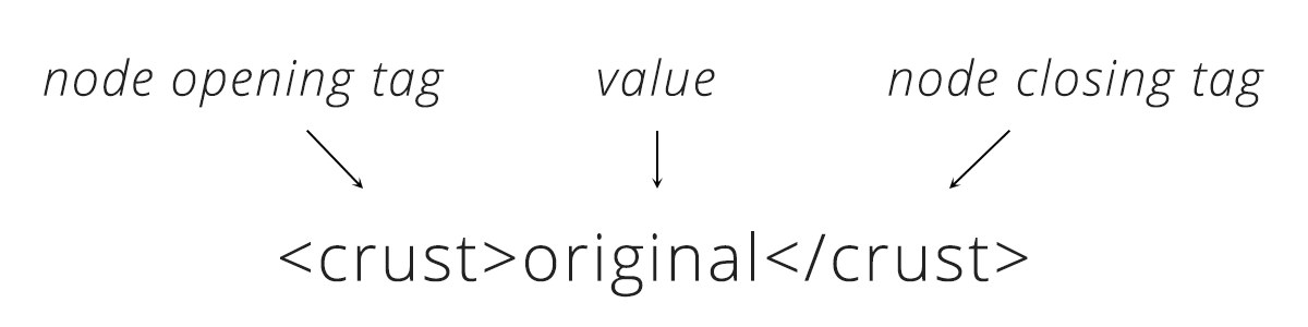 XML provides a few building blocks. The main block is called a node. XML always starts with a root node, inside there are more “child” nodes. The name of the node tells us the attribute of the order and the data inside is the actual details.