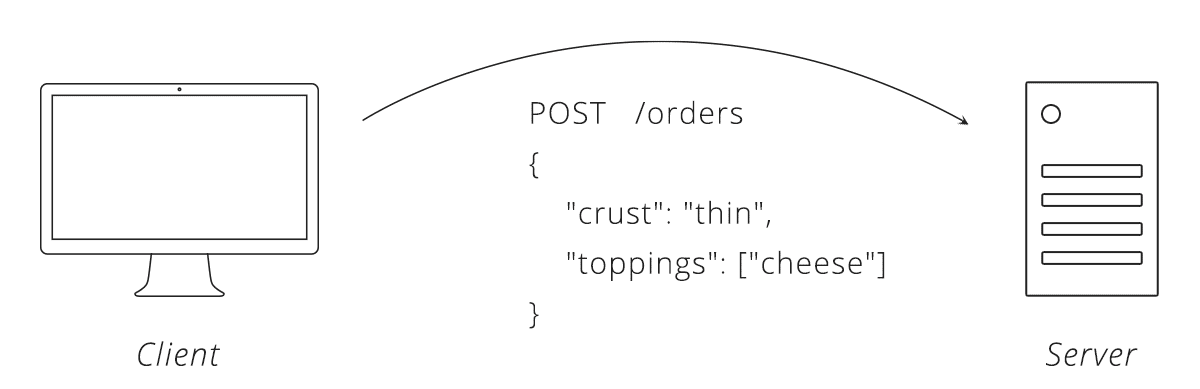 Now we decide what data needs to be exchanged. Coming from our pizza parlour, we can say an order of pizza needs a crust and toppings. We also need to select a data format, lets go with JSON. Here is what an interaction between the client and server might look like using this API: